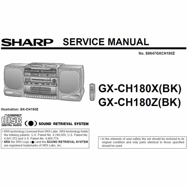 Скачать сервис мануал - Service Manual - на магнитолу SHARP GX-CH180X(BK) и SHARP GX-CH180Z(BK) - музыкальный коплекс включающий в себя радиоприемник, двухкассетный магнитофон, CD-проигрыватель и две акустические системы. Спецификации, инструкции, разборка, схемы электрические принципиальные.