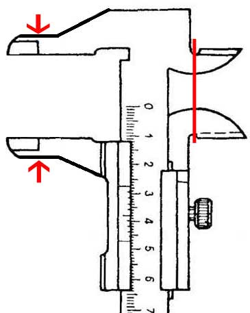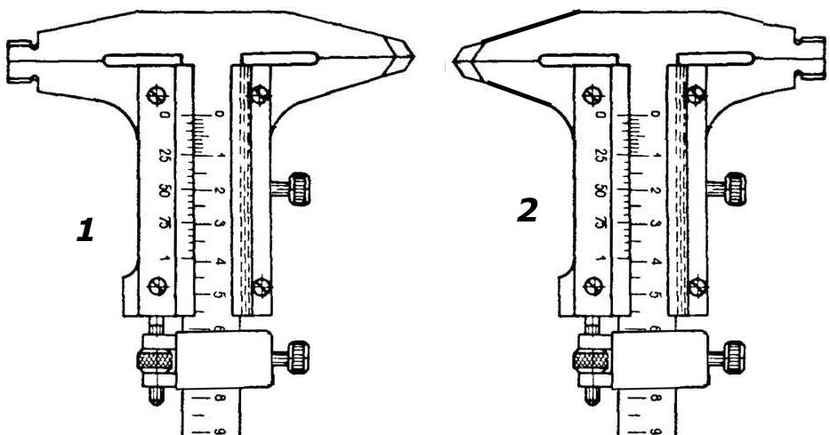 Вот под номером 1 так изначально. Но когда губки внутренних измерений сильно изношены или повреждены (часто плохие работяги начинали измерять, когда шпиндель токарного станка еще не полностью остановился), переделывали: где губки для внутренних измерений стачивали под острие для разметки, а где раньше острые губки были, там вытачивали новые губки, подгонял под размер с плюсом (в допуске), радиус, чистота поверхности - все как положено. Это на рисунке номер 2.