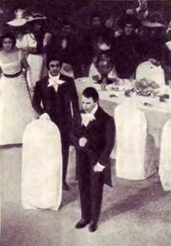 На снимке — сцена из спектакля. Слева направо: Ольга — Гертруда Ян, Онегин — Асен Селимский, Ленский — Веслав Охман.