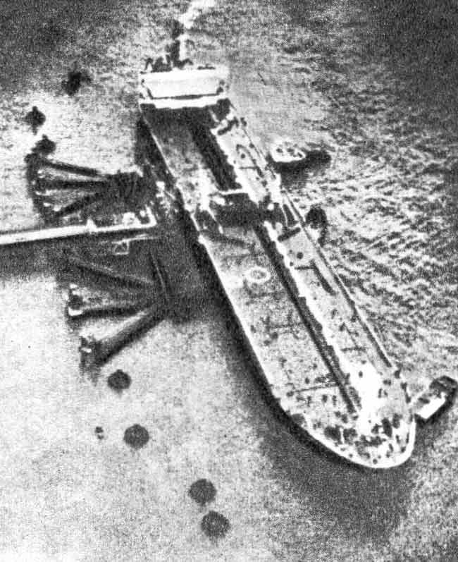 На фото: супертанкер «Мело» после частичной разгрузки швартуется в нефтегавани Транмере.
