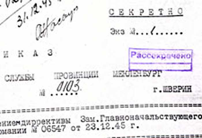 Ниже сего об’являю директиву Заместителя Главноначальствующего Советской Военной Администрации в Германии № 06547 от 23.12.45 г.