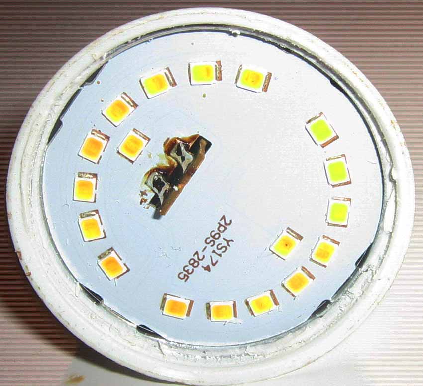Да и сегодня. Вот у меня хорошая дорогая лампочка - года три работала. Потом потухла. Я купил новую. А старую... хотел выбросить, но потом интерес взял - что там с ней? Снял пластмассовый плафончик. Все вроде нормально. Но один светодиод с темной точкой... ага - это он зараза сгорел! Я припаял провод - перемычку и все лампочка вновь работает. |