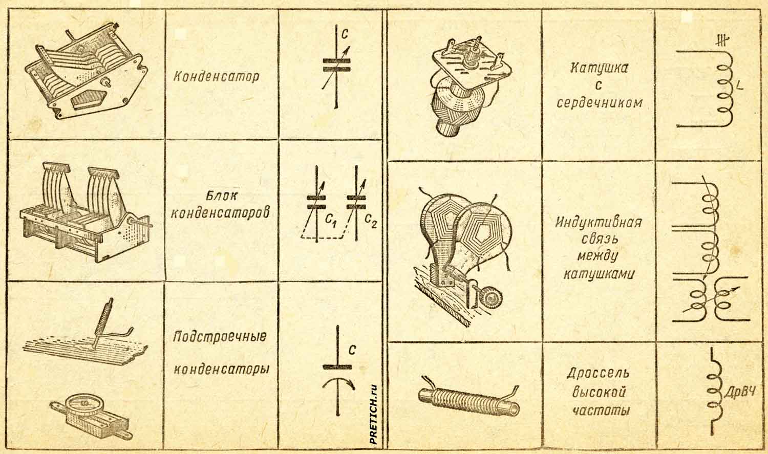 Конденсатор переменной емкости - КПЕ, блок конденсаторов переменной емкости, подстроечные конденсаторы, катушка с сердечником, индуктивная связь между катушками, дроссель высокой частоты.