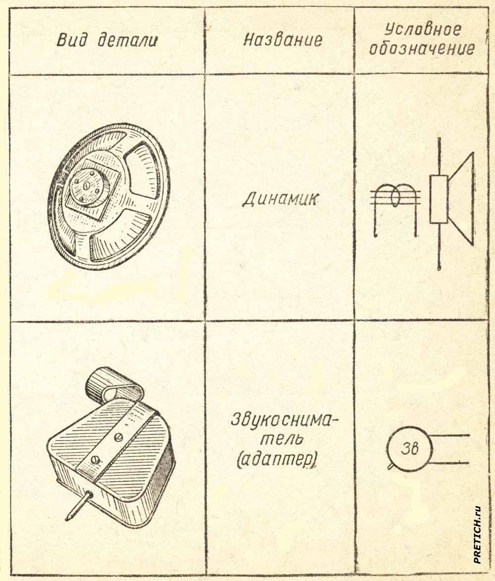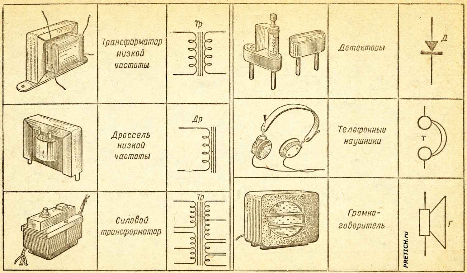 Трансформатор низкой частоты, дроссель низкой частоты, силовой трансформатор, детекторы (диоды), телефонные наушники, громкоговоритель (динамик).