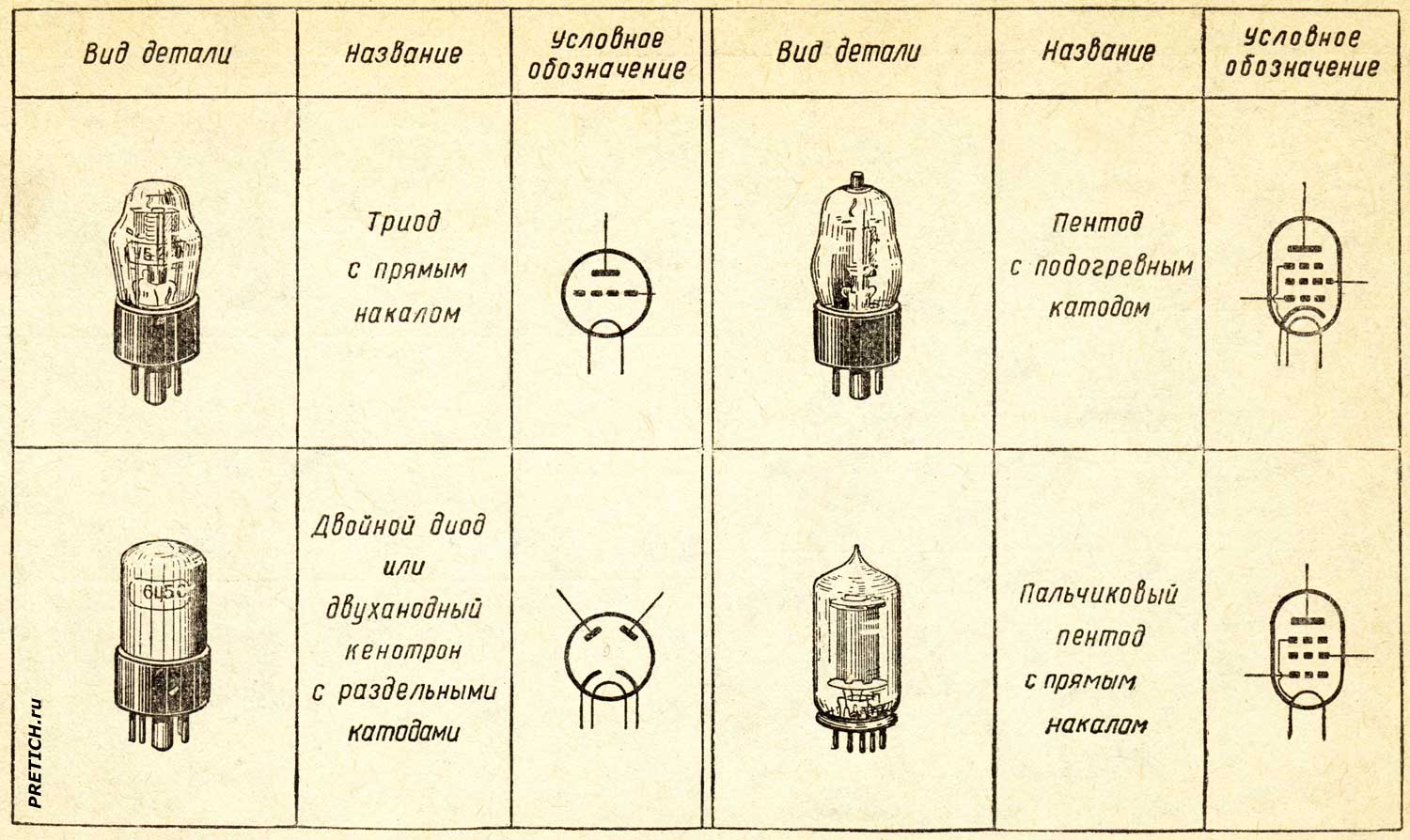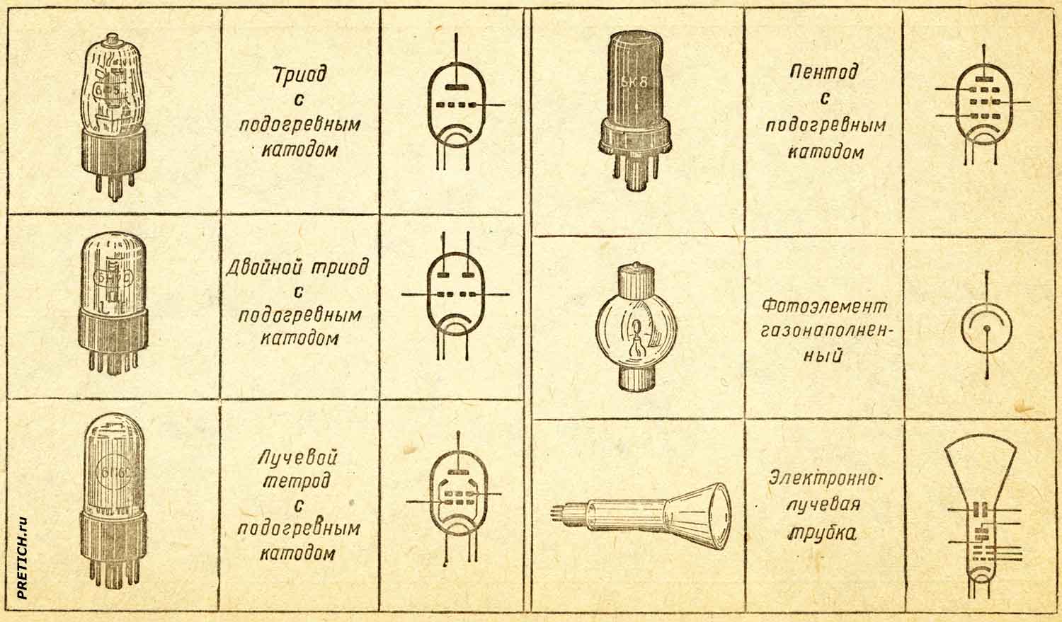 Триод с подогревным катодом, двойной триод с подогревным катодом, лучевой тетрод с подогревным катодом (6116С), пентод с подогревным катодом (6К8), фотоэлемент газонаполненный, электронно-лучевая трубка.