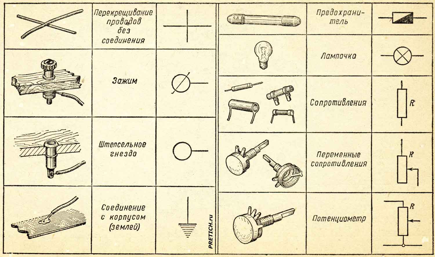 Перекрещивание проводов без соединения, зажим, штепсельное гнездо, соединение с корпусом (землей), предохранитель, лампочка, сопротивление (резистор), переменные сопротивления (резисторы), потенциометр.