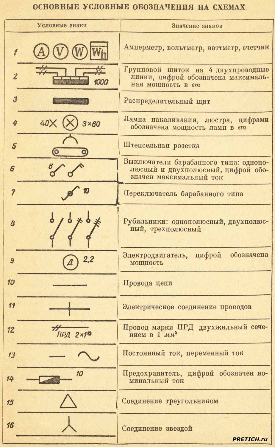 Значения знаков: амперметр, вольтметр, ваттметр, счетчик, групповой щиток на 4 двухпроводные линии, цифрой обозначена максимальная мощность в Вт. Распределительный щит. Лампа накаливания, люстра, цифрами обозначена мощность ламп в Вт. Штепсельная розетка. Выключатели барабанного типа: однополюсный и двухполюсный, цифрой обозначен максимальный ток. Переключатель барабанного типа. Рубильники: однополюсный, двухполюсный, трехполюсный. Электродвигатель, цифрой обозначена мощность. Провода цепи. Электрическое соединение проводов. Провод марки ПРД двухжильный сечением в 1 мм2. Постоянный ток, переменный ток. Предохранитель, цифрой обозначен номинальный ток. Соединение треугольником. Соединение звездой.