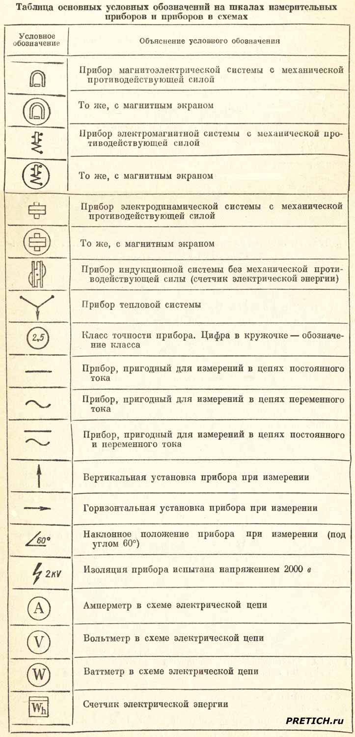 В таблице указаны рисунки условного обозначения и объяснение этих знаков: Прибор магнитоэлектрической системы с механической противодействующей силой. то же, с магнитным экраном. Прибор электромагнитной системы с механической противодействующей силой. то же, с магнитным экраном. Прибор электродинамической системы с механической противодействующей системой. Прибор индукционной системы без механической противодействующей силы (счетчик электрической энергии). Прибор тепловой системы. Класс точности прибора. Цифра в кружочке - обозначение класса. Прибор, пригодный для измерений в цепях постоянного тока. И переменного тока. Вертикальная или горизонтальная установка прибора при измерении. Наклонное положение прибора при измерении (под углом 60 градусов). Изоляция прибора испытана напряжением 2000 В. Амперметр, вольтметр и ваттметр в схеме электрической цепи. Счетчик электрической энергии.
