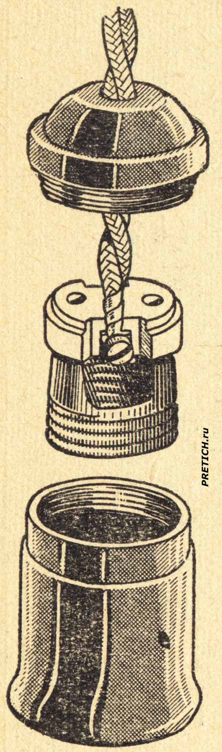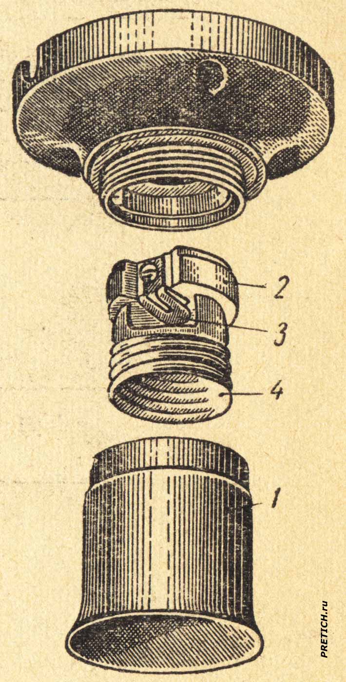 Патрон состоит из боковой крышки - 1, в которую с одного конца вставляют карболитовый или фарфоровый сердечник - 2, с центральным токоведущим контактом - 3, и металлическим цоколем - 4, с резьбой. Сверху сердечник закрывается у подвесного патрона полукруглой крышкой с отверстием для провода, а у потолочного - основанием. Их соединяют с боковой крышкой патрона при помощи резьбы.