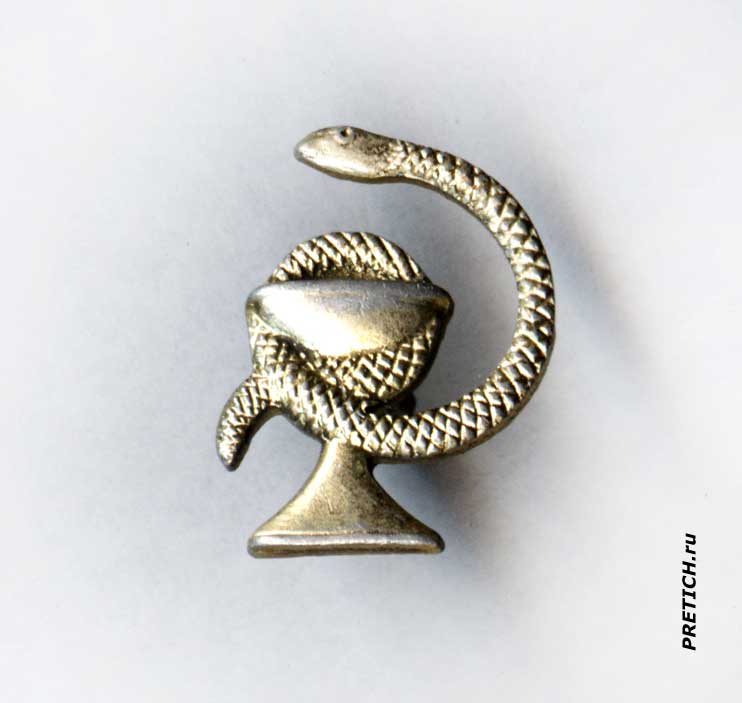 Эмблема для петлиц и погон военно-медицинского состава, в данном случае эмблема серебристого цвета, значит это эмблема военно-ветеринарного состава. Военно-медицинского состава эмблема была точно такой же, но золотого цвета.