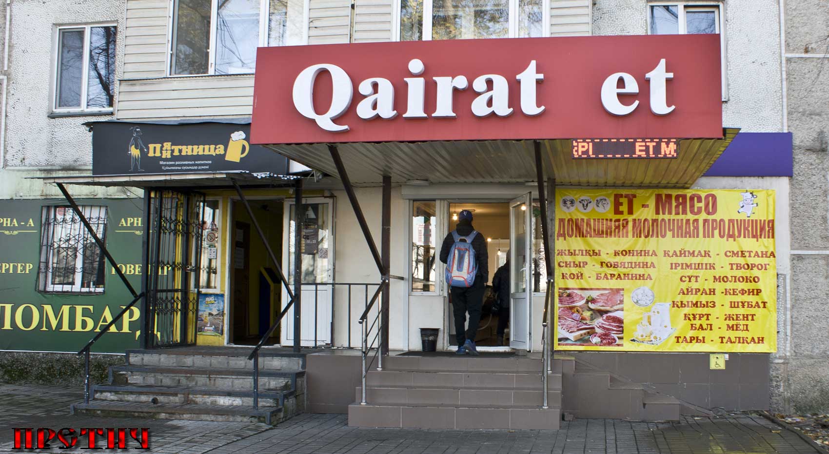 Алматы, улица Биржана, Базарчик - рядом. Мясной магазин Qairat еt - это значит Кайрат мясо... По ценам - как везде, сердите, но не дешево. А влево Пятница - магазин различных напитков, и какой-то ломбард...