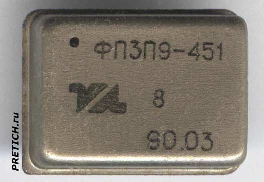 Пьезокерамический или пьезоэлектрический фильтр ФП3П9-451-8 согласно АЦ0.206.096ТУ - это полосовой фильтр ПАВ - поверхностных акустических волн, применялся в модулях УПЧИ радиоканалов телевизоров. На нижней стороне пять выводов.