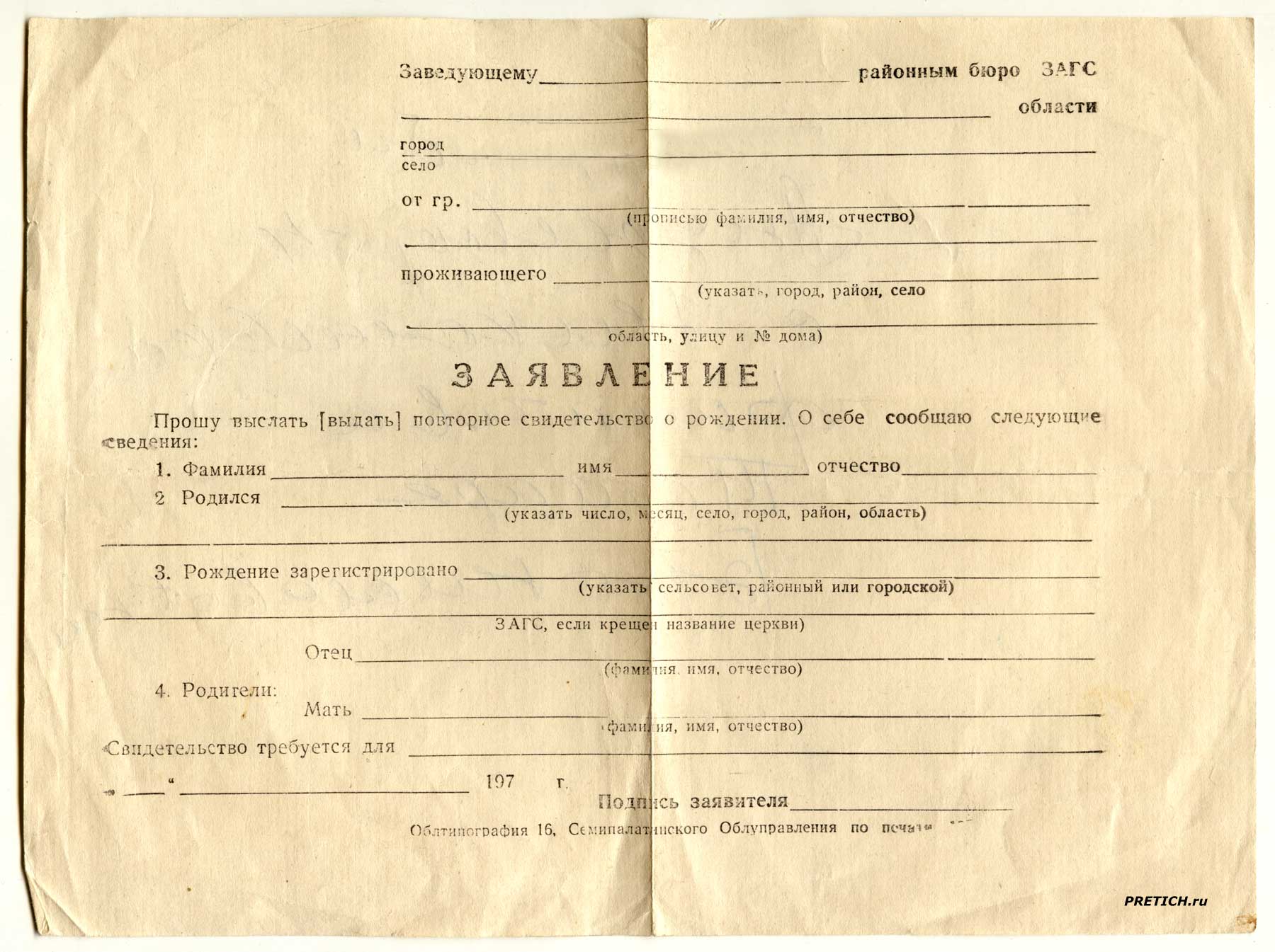 Пустой бланк для ЗАГС по Семипалатинской области Казахской ССР