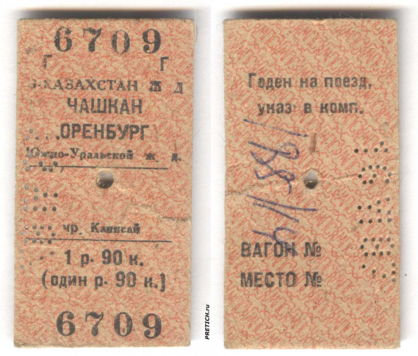 Билет Южно-Уральской железной дороги Чашкан - Оренбург, 1986 год, цена 1 рубль 90 копеек