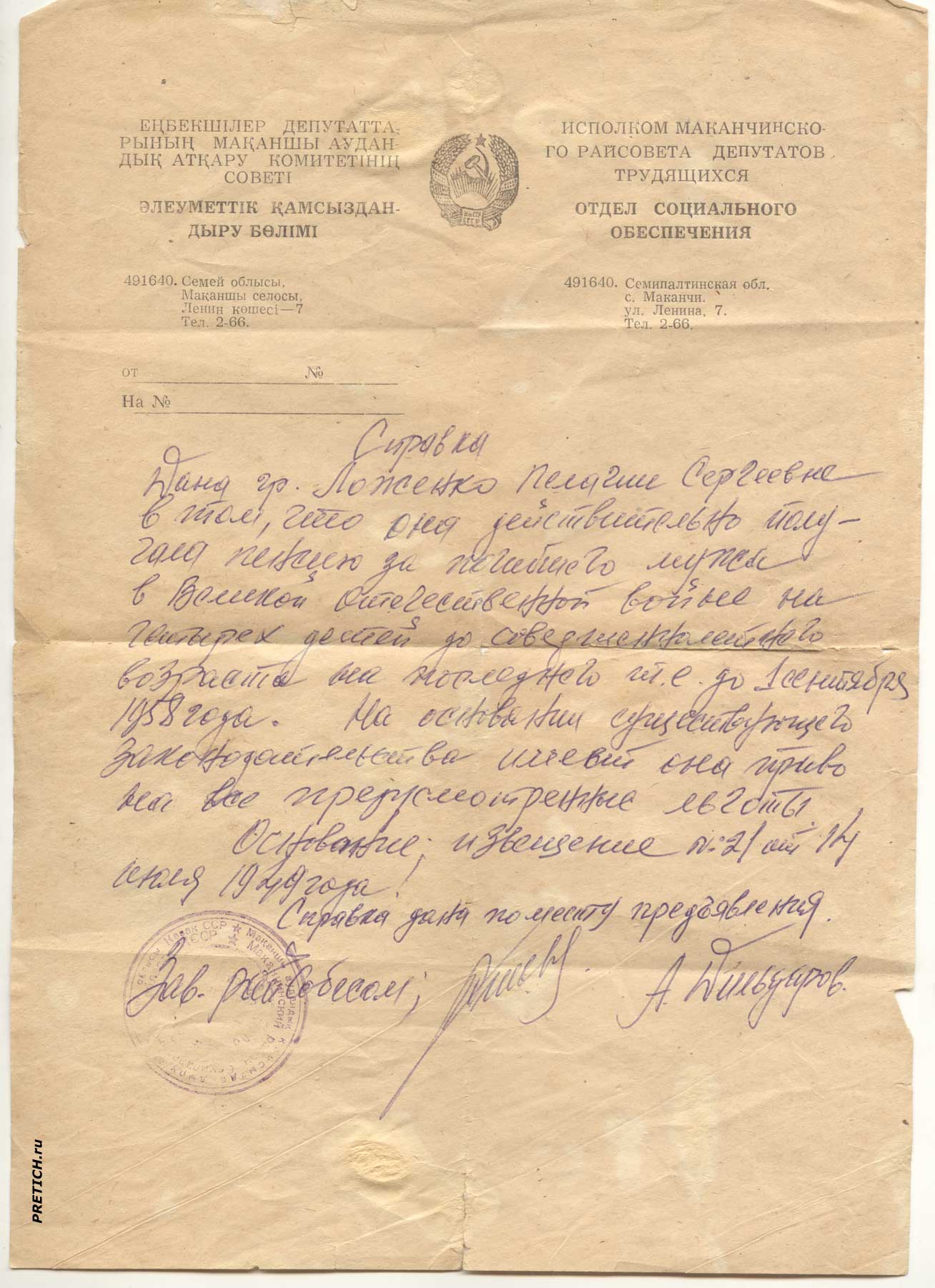 Дана гражданке Ложенко Пелагее Сергеевне в том, что она действительно получала пенсию за погибшего мужа в Великой Отечественной войне на четырех детей до совершеннолетнего возраста, на последнего до 1 сентября 1958 года. На основании существующего законодательства имеет она право на все предусмотренные льготы. Основание: извещение №21 от 14 июля 1949 года.