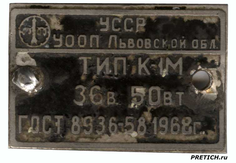 Шильдик на светильник ТИП К-1М 36 В 50 Вт ГОСТ 8936-58 1968 год - УССР УООП Львовской обл.