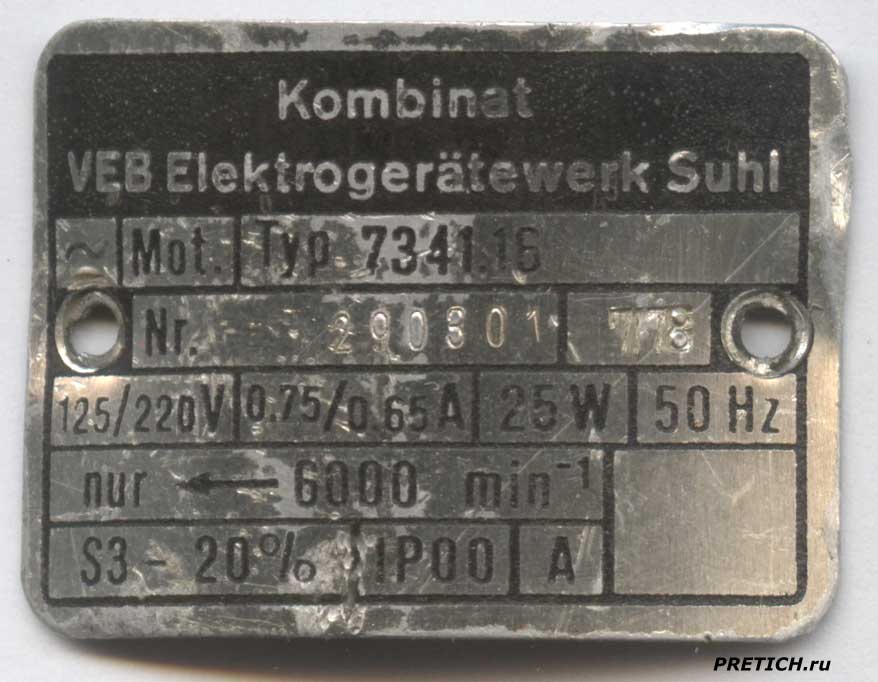 Шильдик на электродвигатель ~ Mot. Typ 7341.16 Kombinat VEB Elektrogeratewerk Suhl