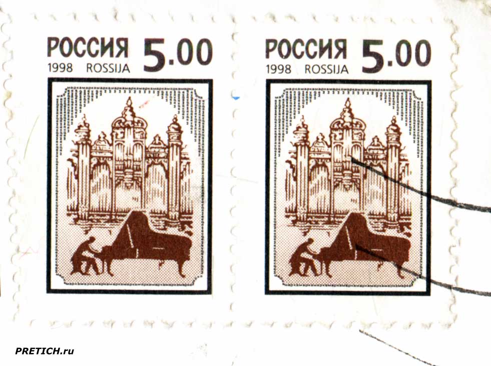 Почтовая марка России, 1998 год, 5 рублей. Без названия. Орган, фортепиано, пианист...