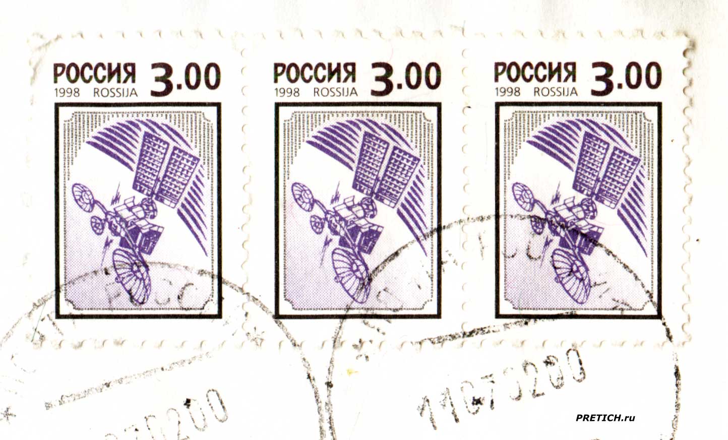 Марка без названия, Почта России 1998 год, цена 3 рубля. Изображен спутник связи на орбите...