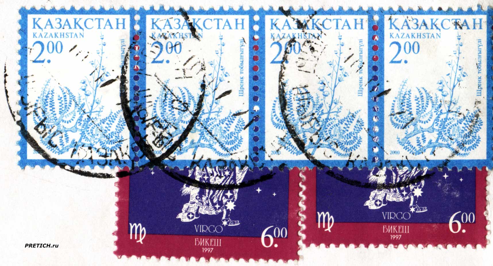 Они наклеены поверх двух других марок - 1997 года, из серии "Знаки Зодиака" - марка Дева, VIRGO, цена 6 тенге