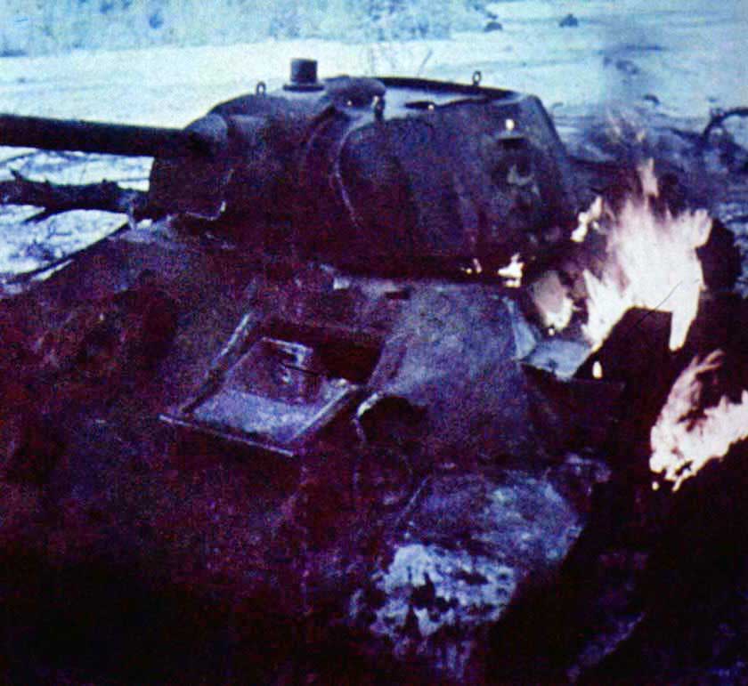 Декабрь 1941 год - горящий Т-34 Битва за Москву, цветное фото.