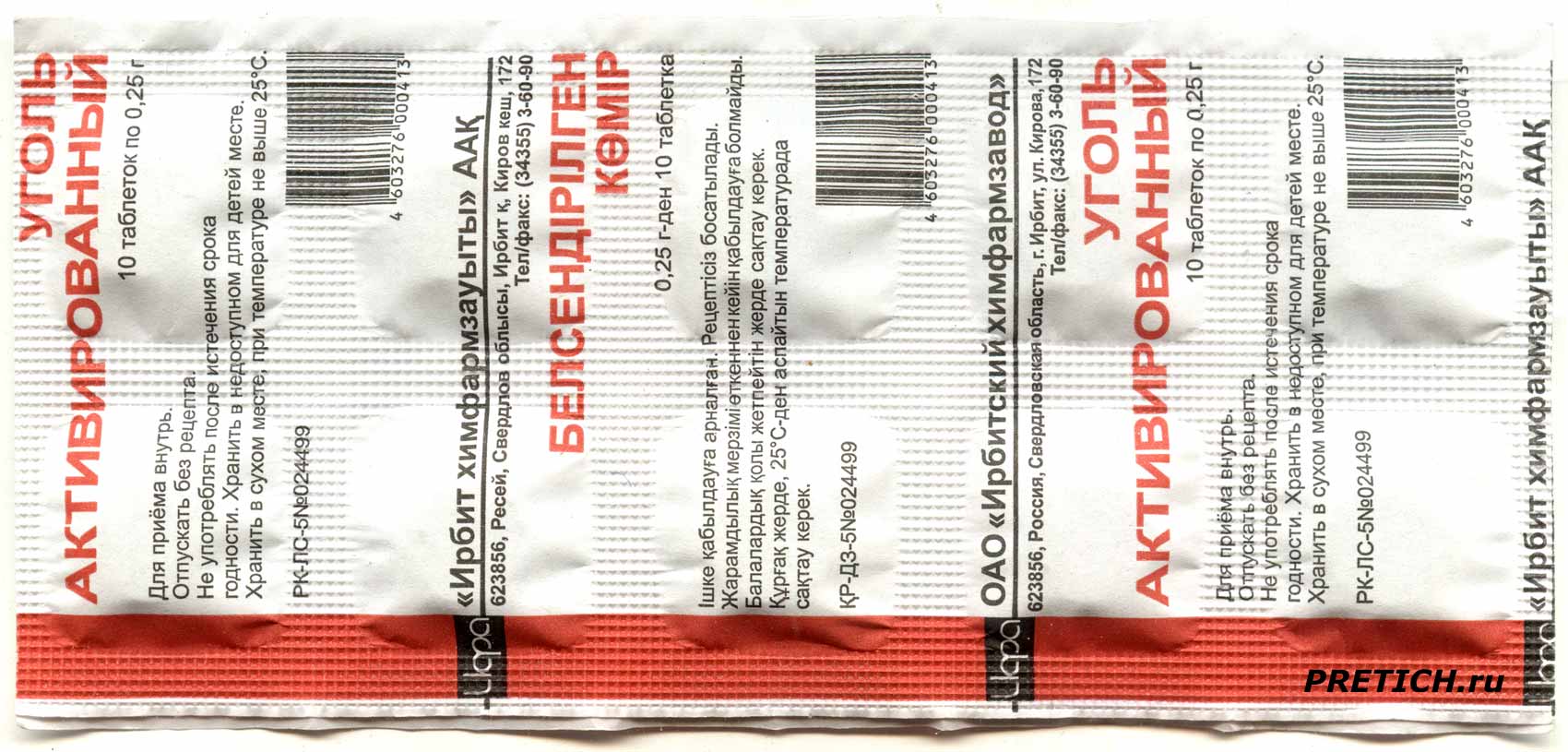 Уголь активированный, производства ОАО "Ирбитский химико-фармацевтический завод". Россия, Свердловская область, г. Ирбит, ул. Кирова, 172