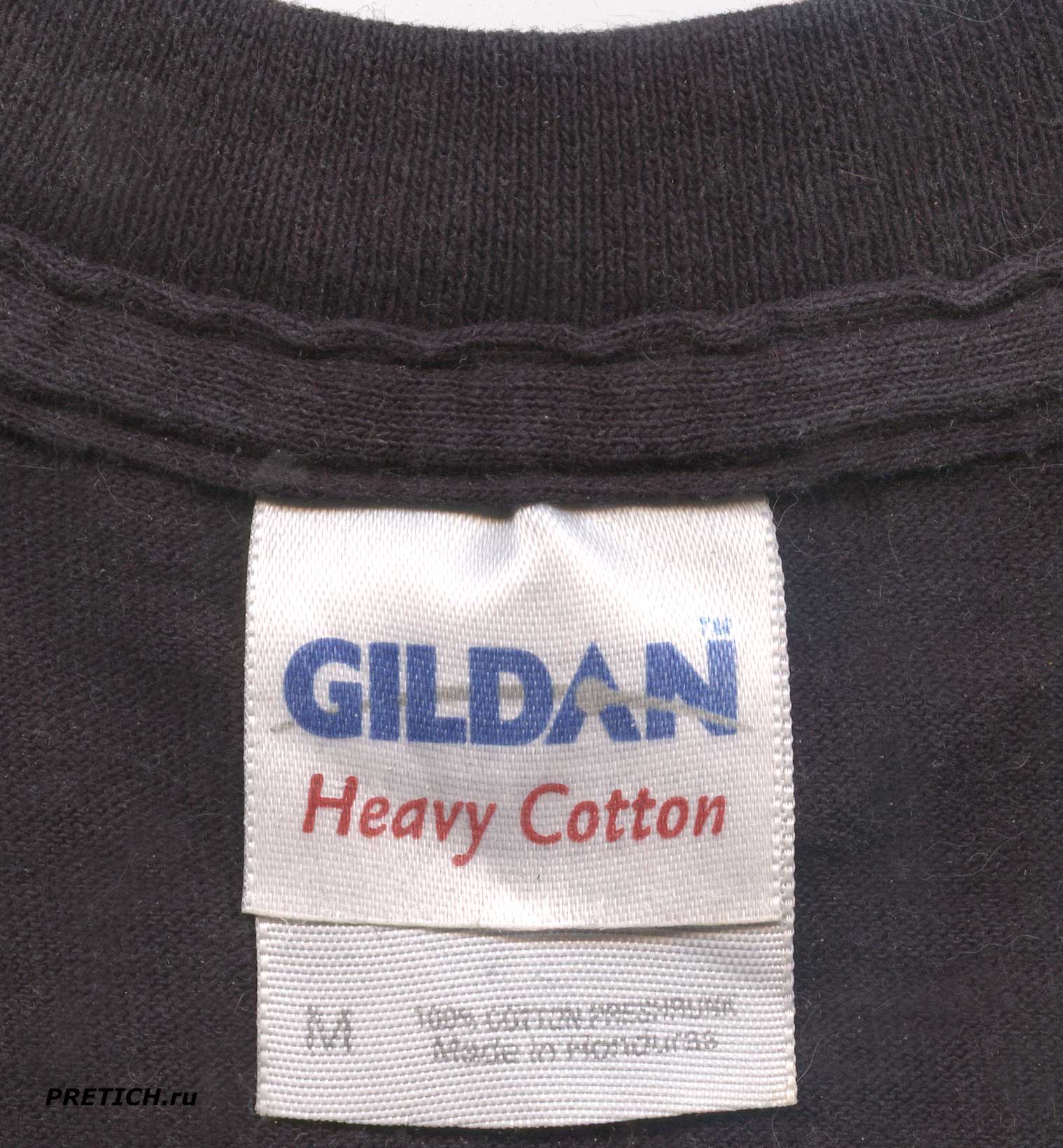 What used to be a good T-shirt is made of relatively thick material, with a double label sewn into the inside of the collar. It has the logo and name - Gildan Heavy Cotton.