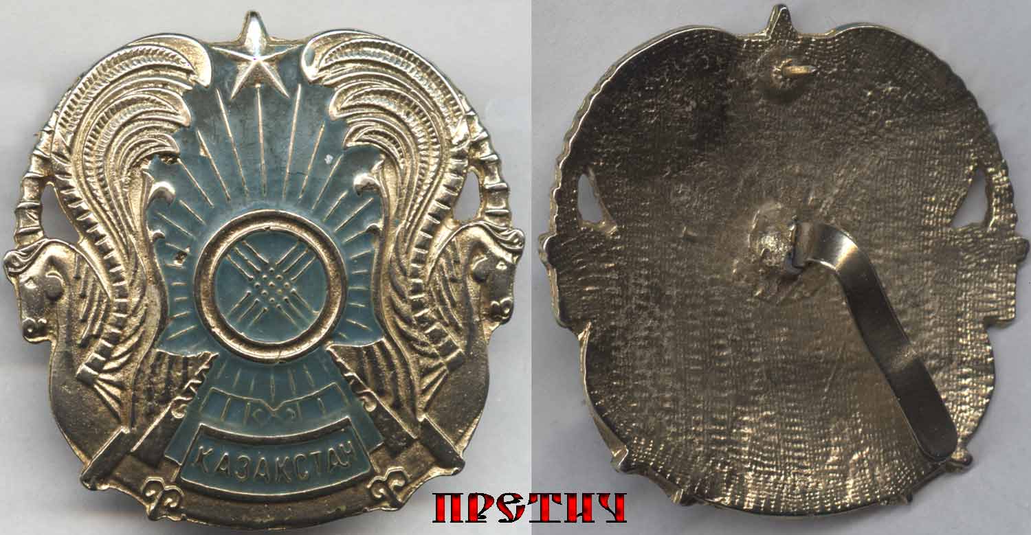 Кокарда ВС республики Казахстан (или прокуратуры, МВД ?) - крепится на тулье. Материал - неизвестный металл, тяжелее алюминия, имеет фиксирующий шип и два лепестка для крепления