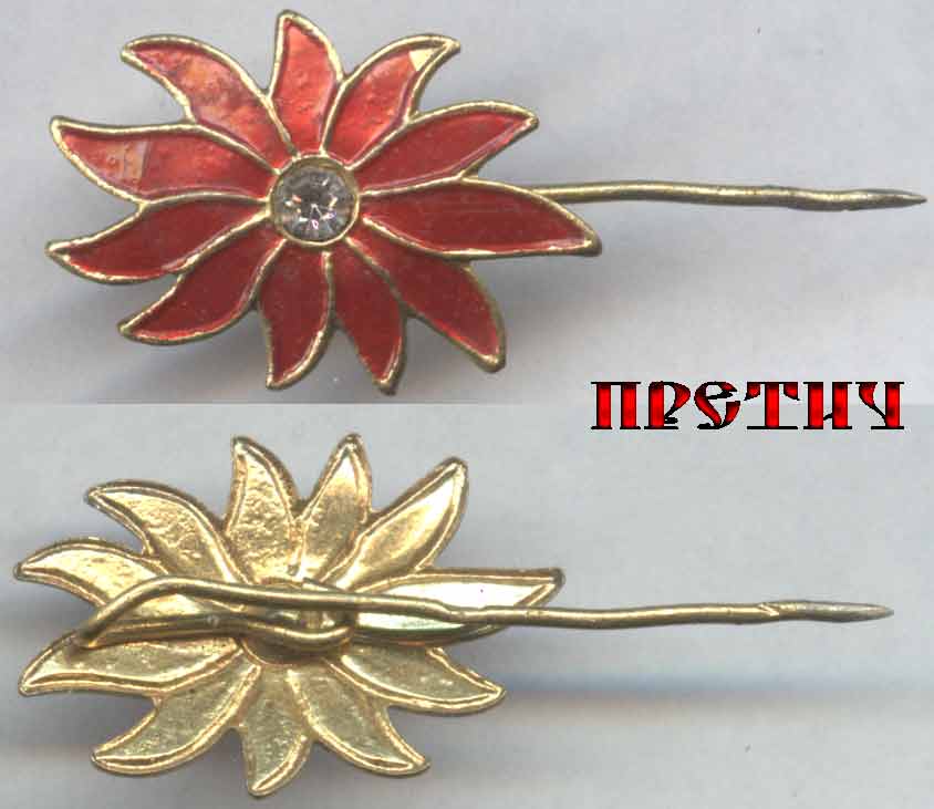 Значок-булавка, значение и применение неизвестны. Латунь. Лепестки цветка - красная эмаль, в центре стеклянный ограненный камешек.