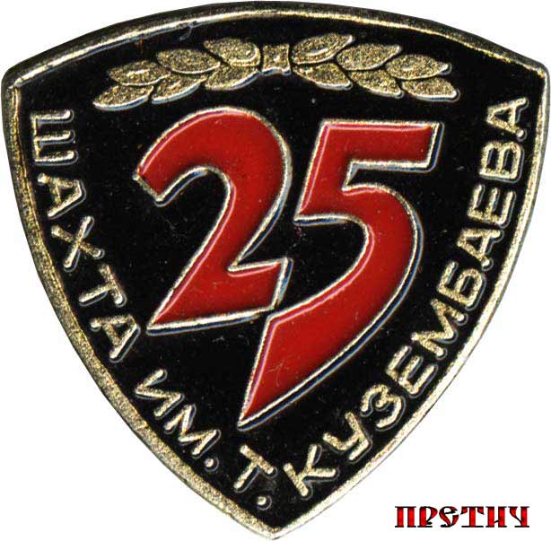 Памятный значок в честь 25-летия шахты им. Т. Кузембаева. 1984 год, Казахская ССР.