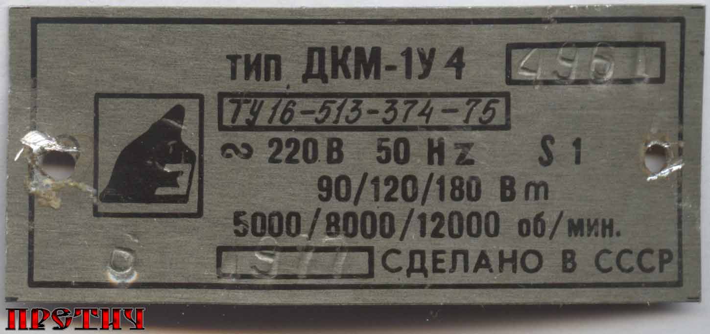 На бирке обозначен логотип завода изготовителя (мною не опознан), надпись: тип ДКМ-1У 4, рядом в прямоугольном поле выбиты цифры - 4961, ниже ТУ 16-513-374-75, ~ 220В 50Hz S1, 90/120/180 Вm, 5000/8000/12000 об/мин, Сделано в СССР и дата изготовления 6 09 77