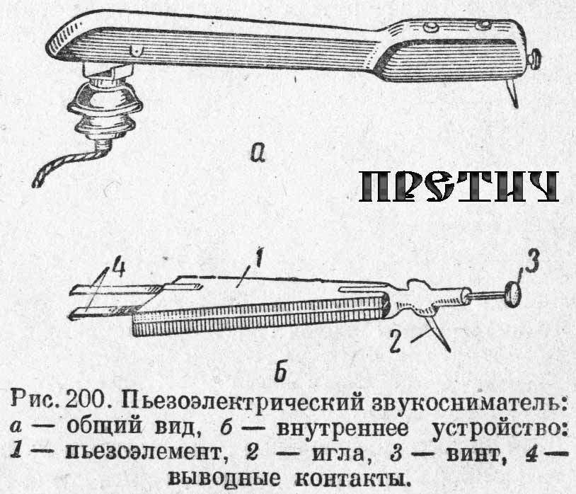 Пьезоэлектрический звукосниматель: а - общий вид, б - внутренне устройство: 1 - пьезоэлемент, 2 - игла, 3 - винт, 4 выводные контакты.