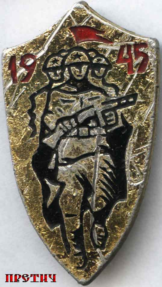 Значок военной тематики - 1945, СССР. В форме щита, с изображением советский бойцов и красными буквами 1945 - Победа над фашистской Германией