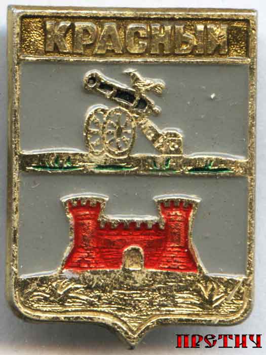 Значок - герб города Красный, СССР. Красный - поселок городского типа Краснинского района Смоленской области России. Впервые упоминается в летописях в 1165 году. На гербе в верхней части изображена колесная пушка, на казенной части которой сидит птица. В нижней части изображена крепостная стена с открытыми воротами и двумя башнями по бокам.
