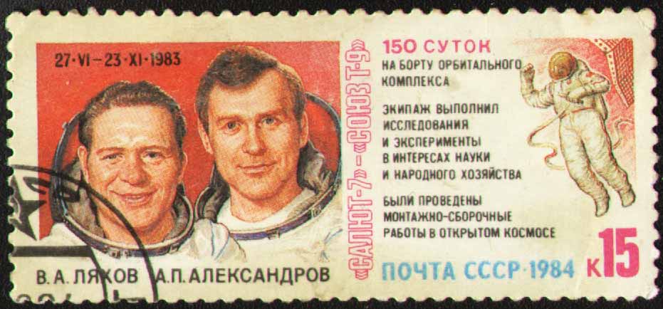 Марка - Салют-7 Союз Т-9, 150 суток на борту орбитального комплекса, экипаж выполнил исследования и эксперименты в интересах науки и народного хозяйства, были проведены монтажно-сборочные работы в открытом космосе. 27.VI-23.XI.1983 В.А. Ляхов А.П. Александров. Почта СССР, 1984, 15 копеек, серия "Космос"