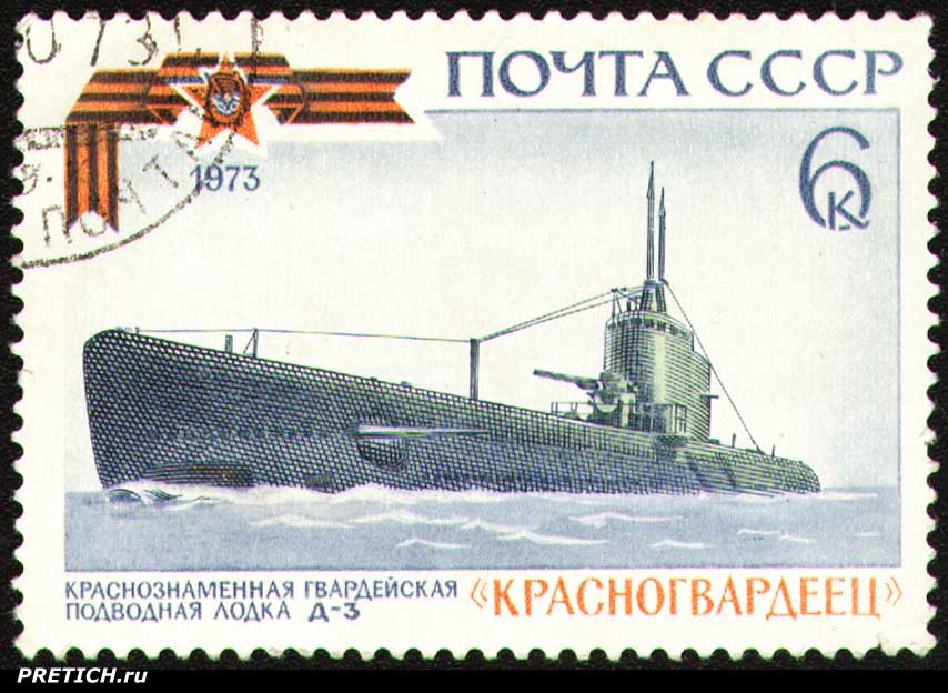 Почтовая марка - Краснознаменная гвардейская подводная лодка Д-3 "Красногвардеец". Почта СССР. 1973. 6 копеек. Серия ВМФ СССР.