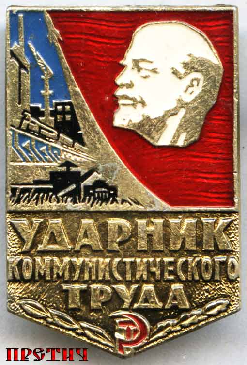 Нагрудный знак - Ударник коммунистического труда, СССР. Широко распространенный значок, имел несколько видов. При вручении этого значка одновременно вручалась книжка - удостоверение ударника коммунистического труда.