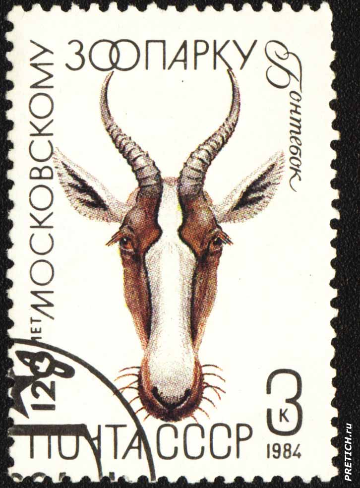 Почтовая марка: Бонтебок (Беломордый бубал). 120 лет Московскому зоопарку. 1984. Почта СССР. Серия "Фауна"