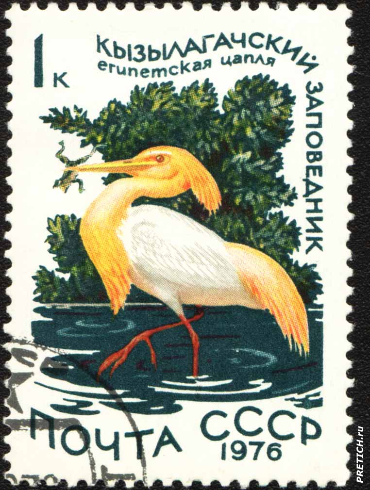 Почтовая марка: Египетская цапля. Кызылагачский заповедник. 1976. Почта СССР. Серия "Фауна"