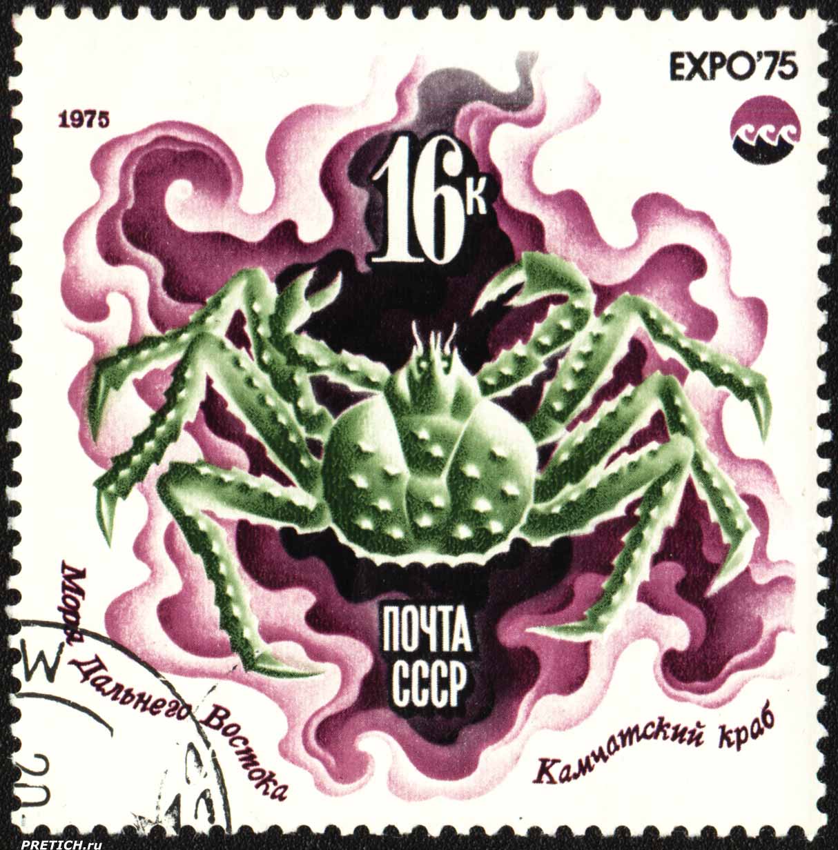 Почтовая марка: Камчатский краб, моря Дальнего Востока. EXPO'75. 1975. Почта СССР. Серия "Фауна"