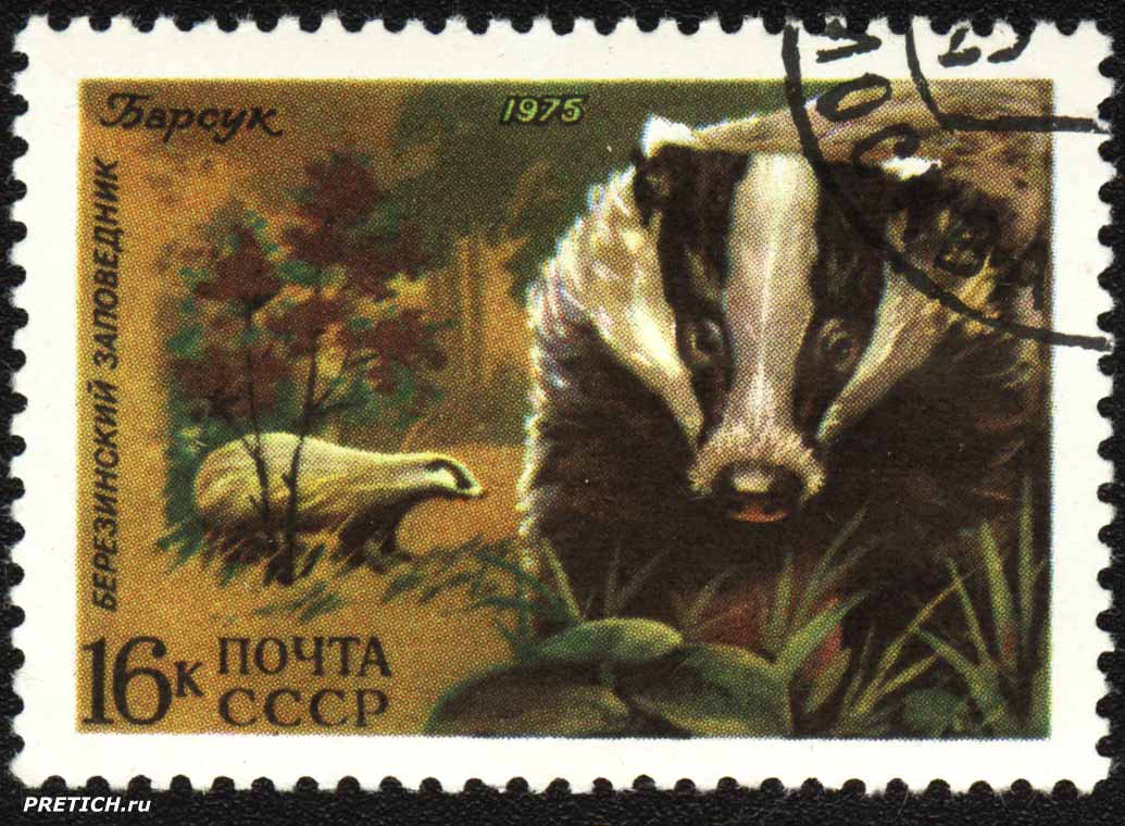 Почтовая марка: Барсук. Березинский заповедник. 1975. Почта СССР. Серия "Фауна"