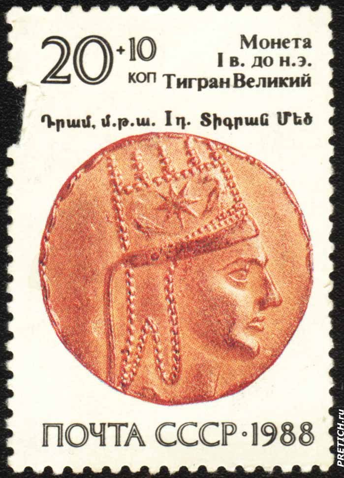 Почтовая марка: Монета I в. до Н.Э Тигран Великий. 1988. Почта СССР.