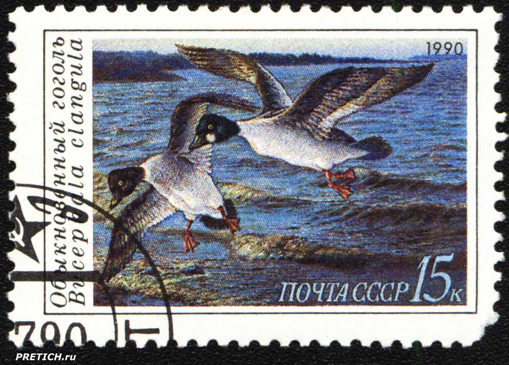 Почтовая марка: Обыкновенный гоголь - Bucephala clangila. 1990. Почта СССР. Серия "Фауна"