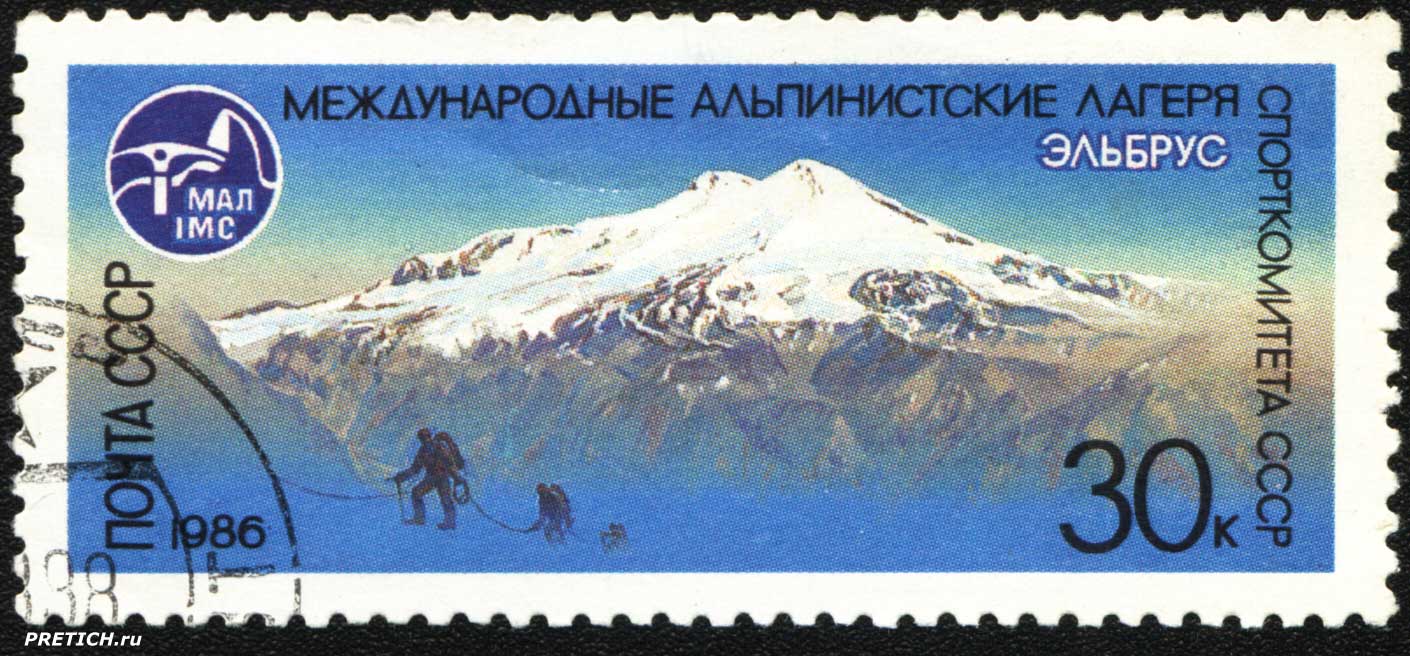 Почтовая марка: Эльбрус. Международные альпинистские лагеря Спорткомитета СССР. МАЛ-IMC. 1986. Почта СССР.