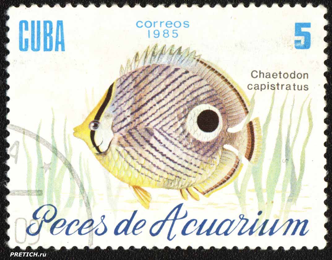 Почтовая марка Кубы: Chaetodon capistratus - Peces de Acuarium. 1985. Cuba Correos.