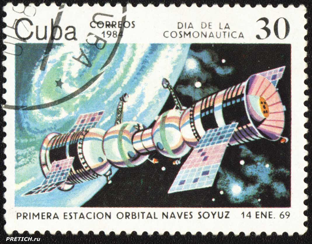 Почтовая марка Кубы: Primera Estacion Orbital Naves Soyuz 14 ene.69 - Dia de la Cosmonautica. 1984. Cuba Correos. Стыковка двух КК Союз, СССР