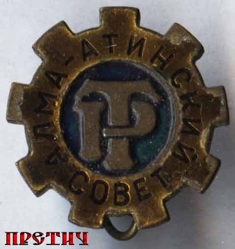Значок - Алма-Атинский совет, а в центре буквы РТ, СССР. Значок в форме шестерни. Что за значок так и не выяснено.