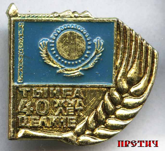 Памятный значок - 40 лет Целине - 40 жыл ТЫНFА, Республика Казахстан. На значке изображен современный флаг республики Казахстан, колос пшеницы