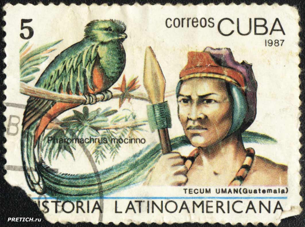 Почтовая марка Кубы: Pharomachtus mocinno. Tecum Uman (Guatemala). Historia Latinoamericana. 1987. Cuba Correos.