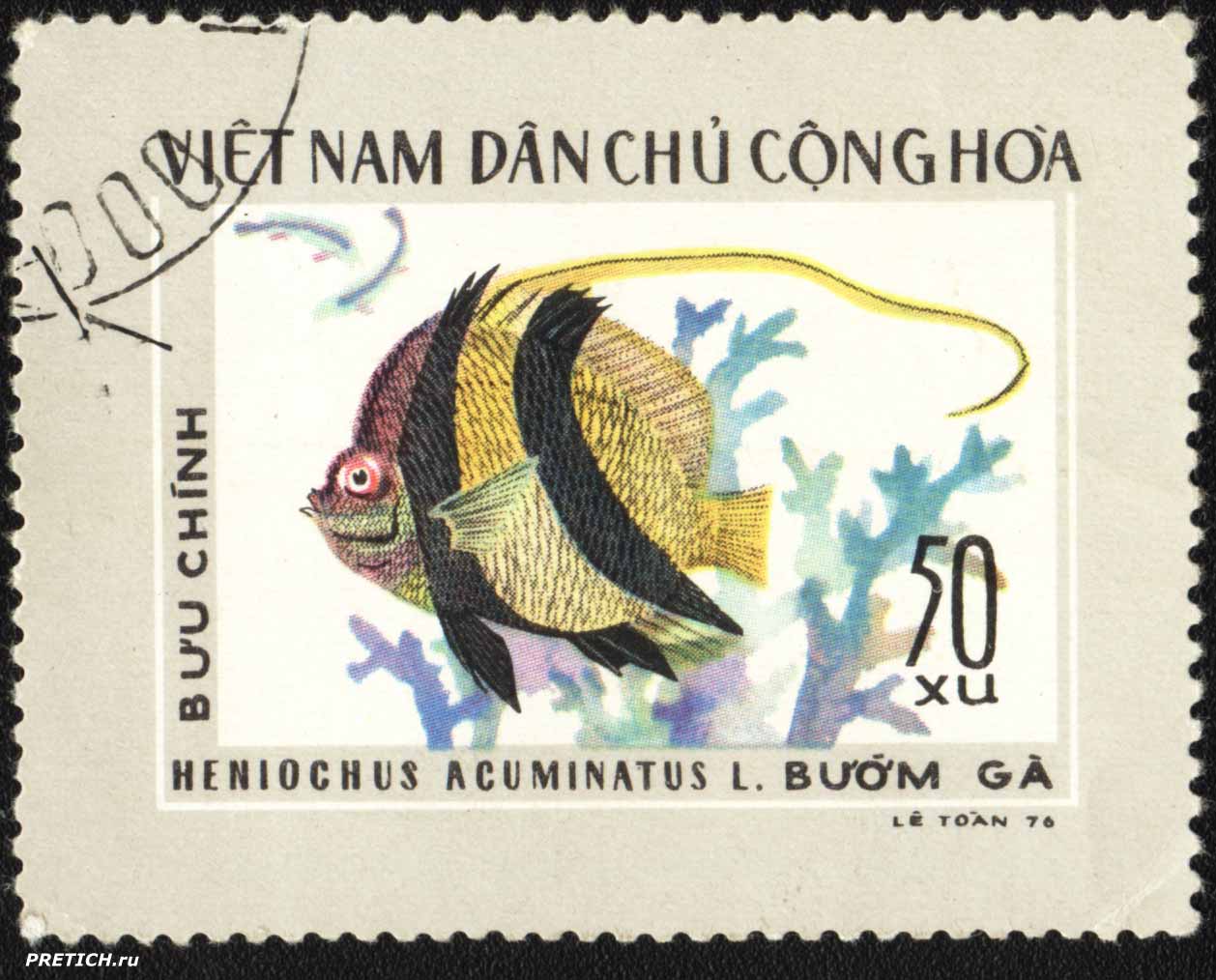 Почтовая марка Вьетнама: Heniochus acuminatus L. 1976. Viet Nam